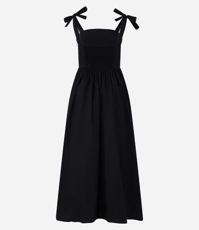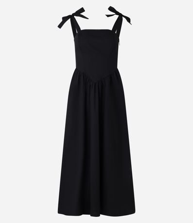 Ref: Vestido midi evasê confeccionado em tricoline, com decote quadrado, cintura em v e alças de amarração.