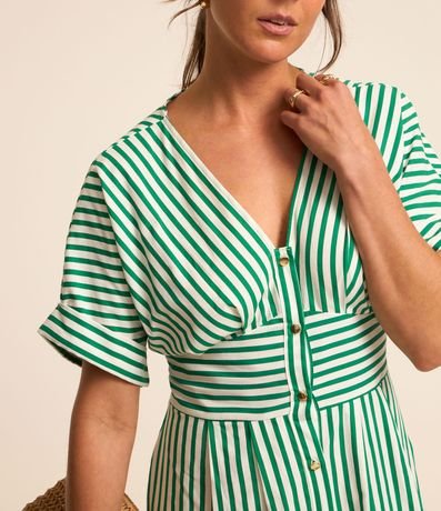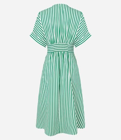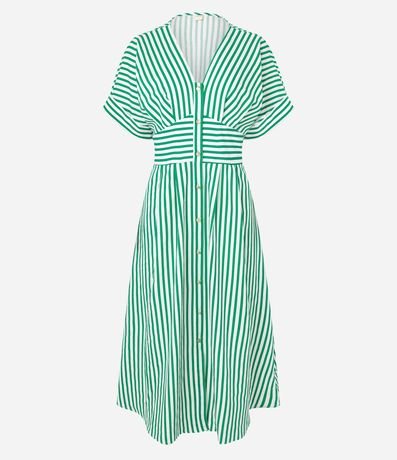 Ref: Vestido feminino, gola em v, modelo midi evasê, pala na cintura, manga 3/4. Peça contém listras e abotoamento frontal dourado.