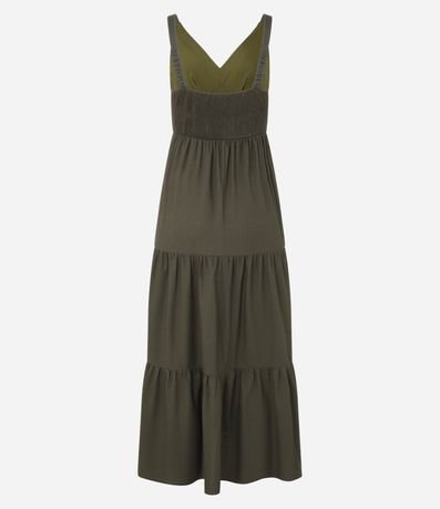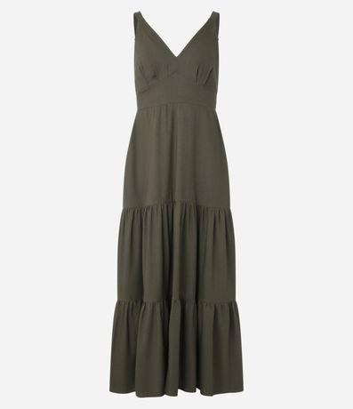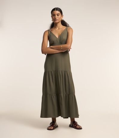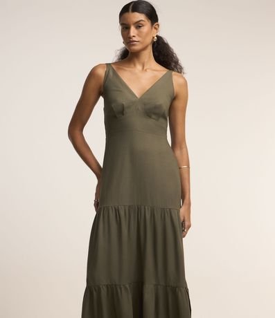 Ref: Vestido midi evasê confeccionado em viscose e linho, com deconte em v, alça fina e babados. Não acompanha o lenço.