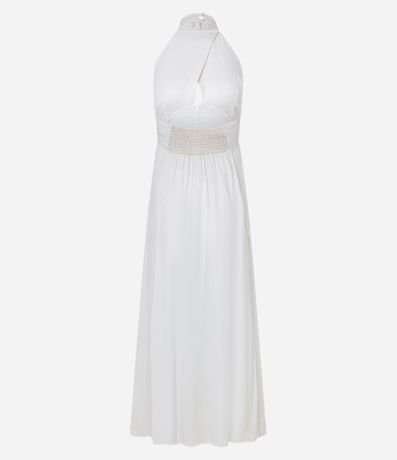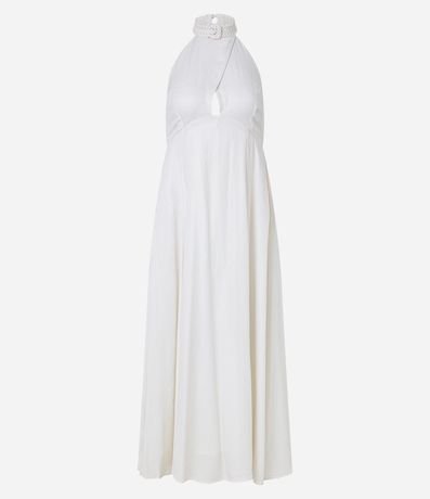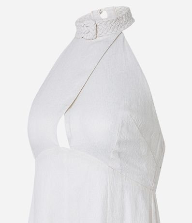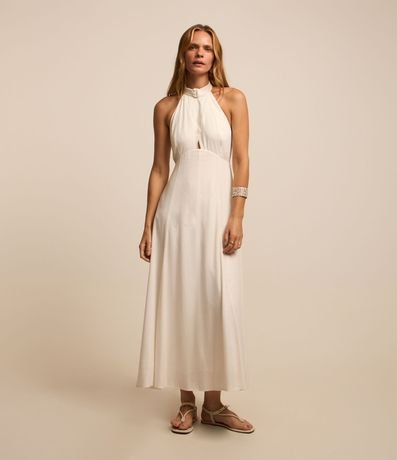 Vestido feminino, midi evasê, confeccionado com viscose mais sustentável. Peça contém detalhe diferenciado na gola de cinto trançado e cava americana.