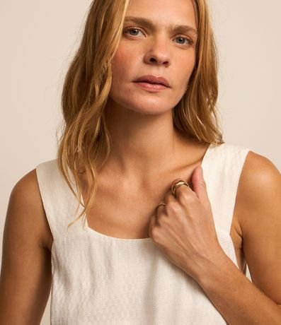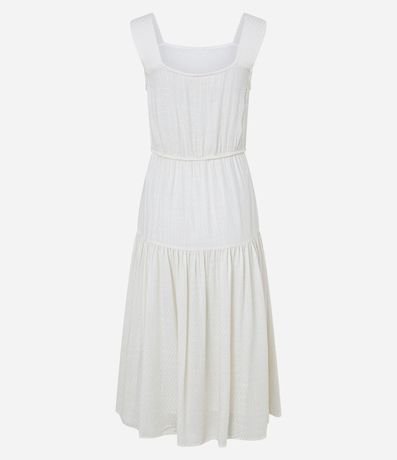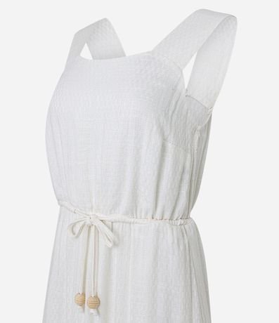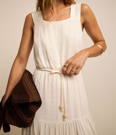 Vestido feminino, modelo midi evasê, confeccionado em viscolinho mais sustentável, decote quadrado, sem mangas, tiras largas e cordão para amarração com miçangas.