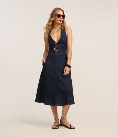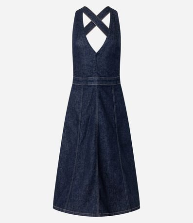 Ref: Vestido midi de frente única, confeccionado em jeans, com alças largas cruzadas, com fechamento por zíper nas costas e recortes frontais com costura aparente. Este produto possui algodão certificado BCI em sua composição, além de ter sido produzido através de processos mais sustentáveis, sendo ambientalmente mais responsável.