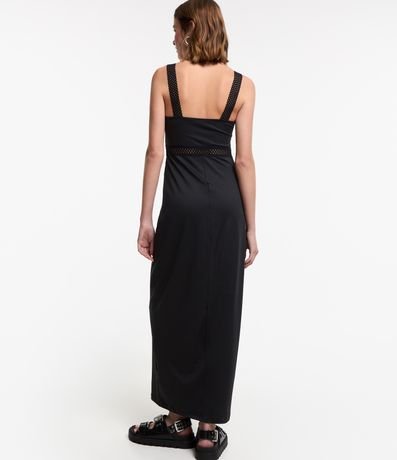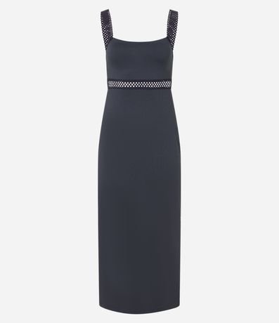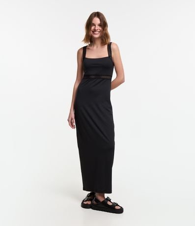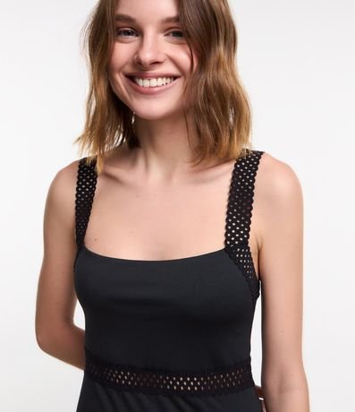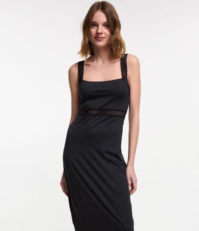 Vestido midi com alças largas e textura furadinha, decote quadrado e confeccionado em poliéster.