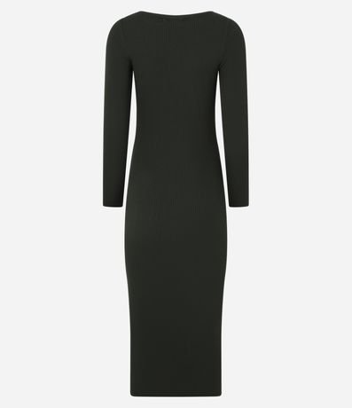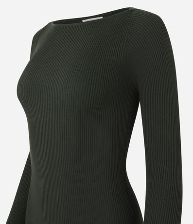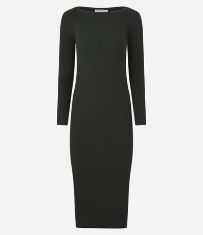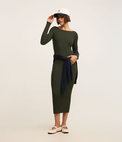 Vestido midi ajustado em tricô leve, com gola canoa, mangas longas e malha texturizada.