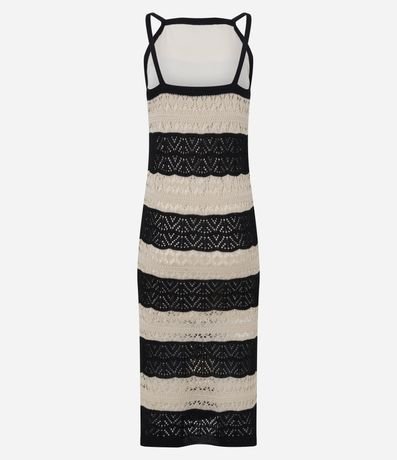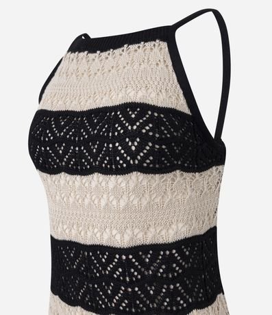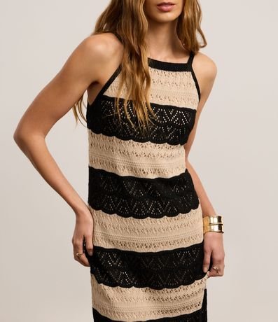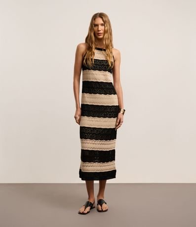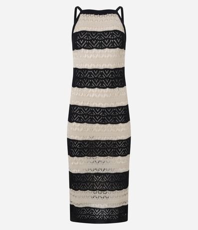 Ref: Vestido reto midi, confeccionado em tricô, com decote halter e listras horizontais em grandes blocos. A peça foi construída com pontos diferenciados com aberturas que remetem ao crochê, conferindo ao item um toque bastante artesanal.