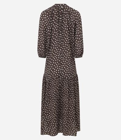 Ref: Vestido midi feminino confeccionado em viscose certificada através de boas práticas ambientais. Possui estampa de poás, gola com amarração e abertura frontal parcial. Possui mangas longas com elástico nos punhos, leve franzido na região do colo