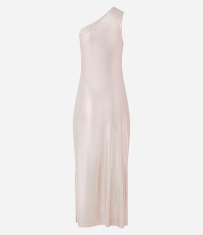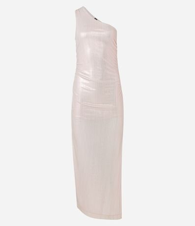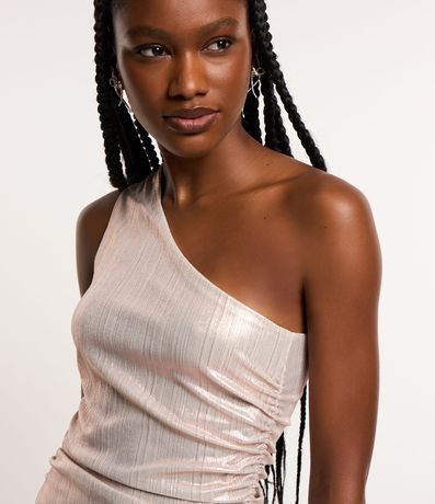 Vestido feminino de modelo midi, com decote ombro só e sem estampa. Possui franzido na lateral, textura metalizada e fenda.
