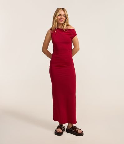 Vestido feminino de comprimento midi, modelo juntinho, confeccionado em malha de poliéster e elastano, e sem estampa. Possui decote reto assimétrico, ombro a ombro, franzido no ombro e fenda na barra traseira.