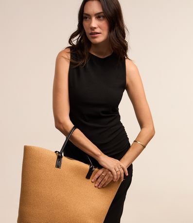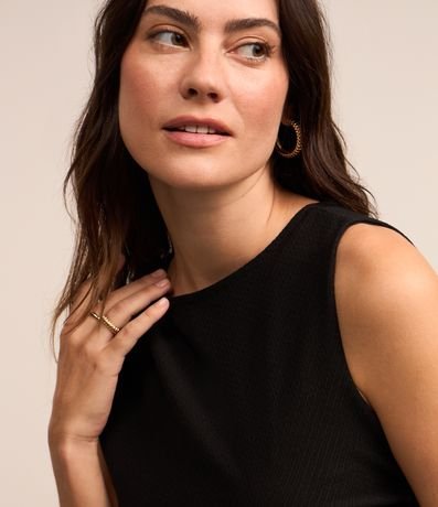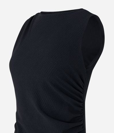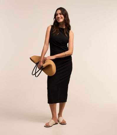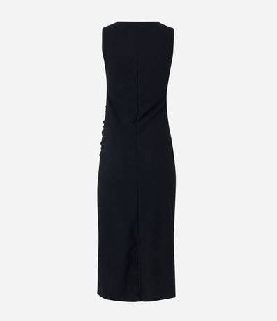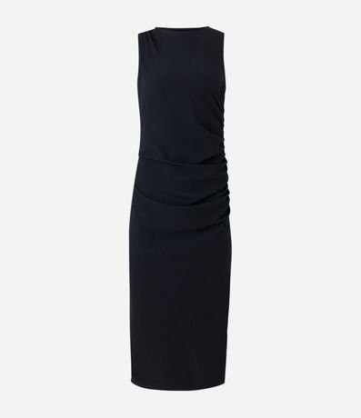 Ref: Vestido feminino midi, sem mangas, gola redonda, detalhe drapeado lateral e superfície sem estampa.