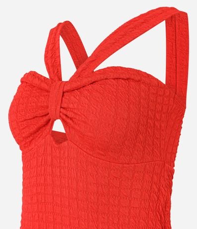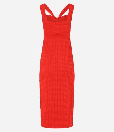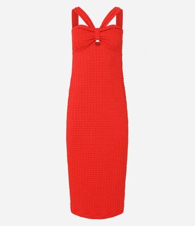 Ref: Vestido feminino de modelo midi, texturizado, com recorte no decote e alças cruzadas na frontal.
