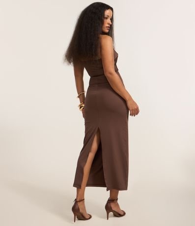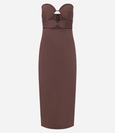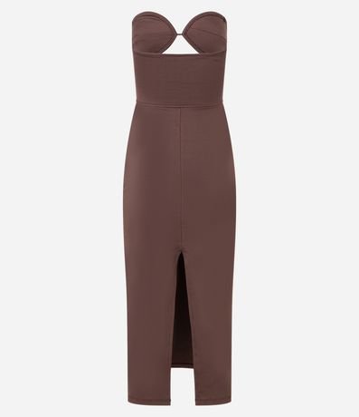 Vestido midi com decote tomara que caia com busto pespontado e recorte vazado e fenda frontal.