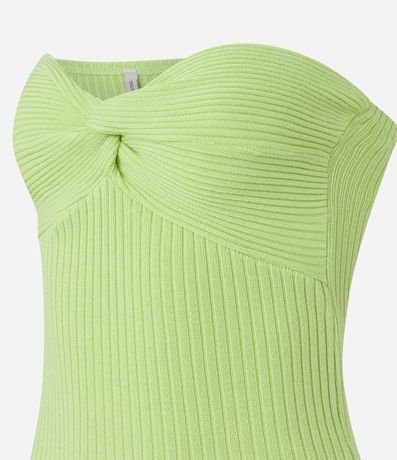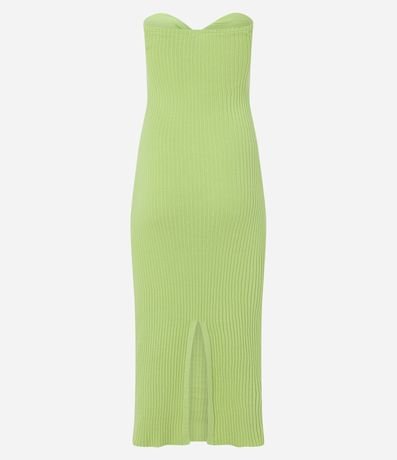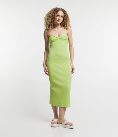 Ref: Vestido midi tomara que caia em tricô, com decote coração torcido, fenda nas costas e textura canelada.