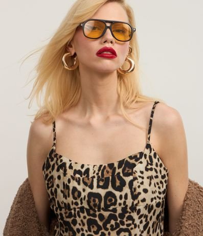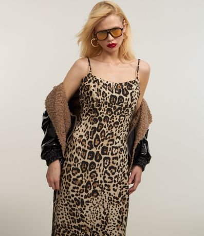 Vestido new midi com alça fina, em textura acetinada e estampa animal print, oncinha.