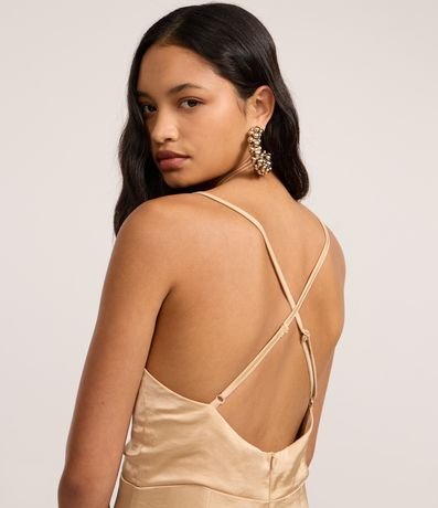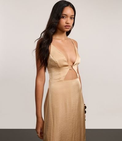 Vestido de cetim com alças finas, decote V e recorte no busto com argola.