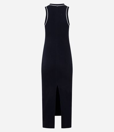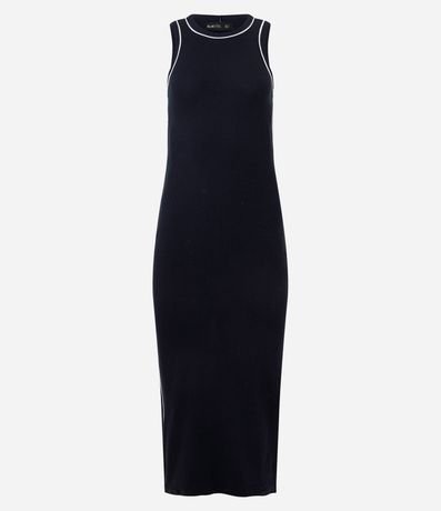 Ref: Vestido new midi, sem mangas, confeccionada em ribana, com gola redonda e contrastes na gola e cava. Peça com fenda na barra e textura canelada Este produto possui material mais sustentável em sua composição, sendo ambientalmente mais responsável.