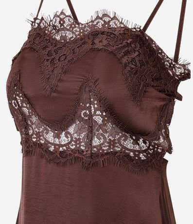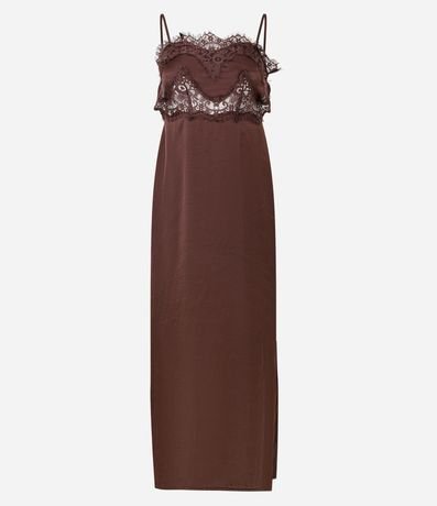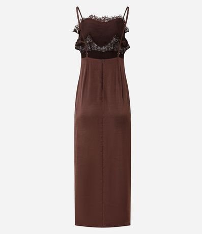 Ref: Vestido new midi em cetim, sem mangas, com busto estruturado e aplicação de renda detalhada na frente. Possui alças finas, costas abertas com recorte profundo com fechamento em zíper, modelagem reta e caimento leve, ideal para produções elegantes e noturnas.