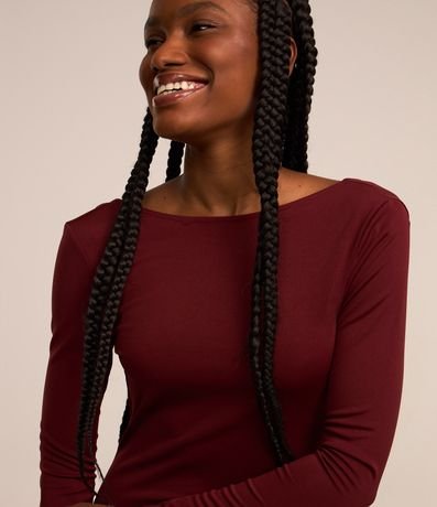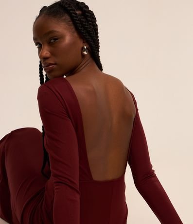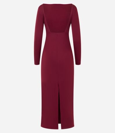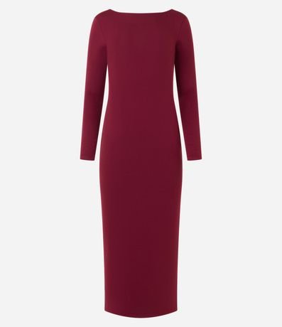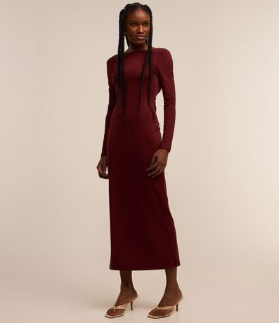 Ref: Vestido new midi com mangas longa, decote canoa com costas abertas, sem estampa e com fenda na parte de trás.