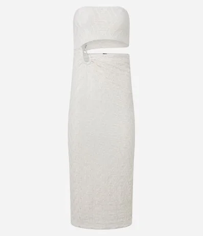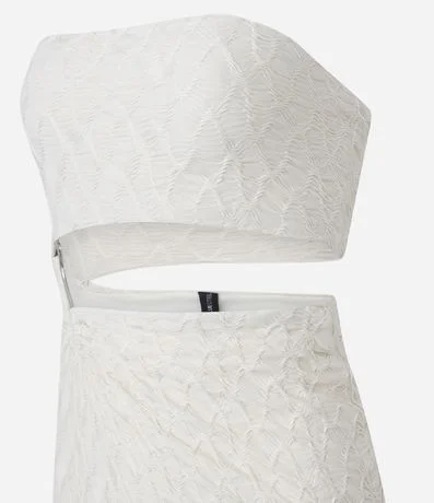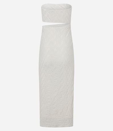 Vestido new midi com decote tomara que caia, texturizado, recorte vazado, cut out na cintura e detalhe em aviamento na lateral.