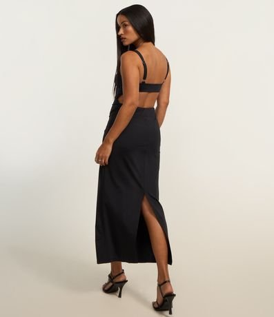 Vestido new midi com alça larga, confeccionado em poliamida, decote v com recorte vazado, aviamento frontal, alça larga com regulagem e fenda na parte de trás.