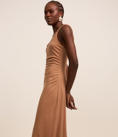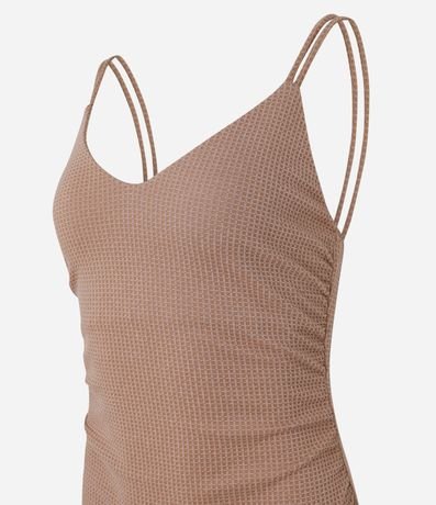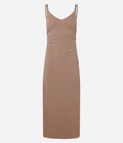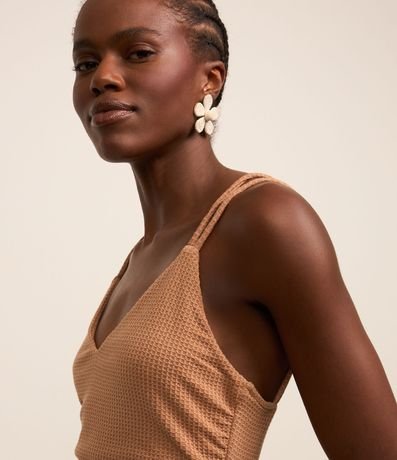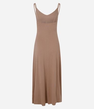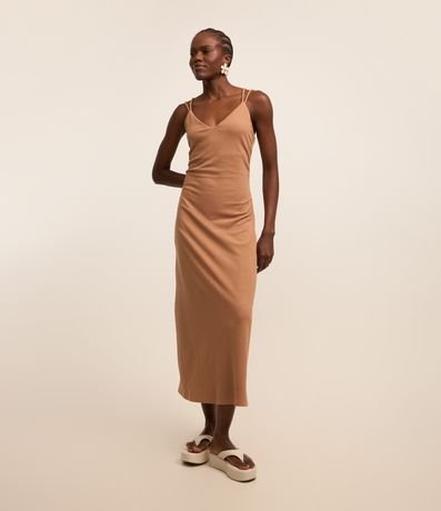 Vestido evasê new midi confeccionado em poliviscose, decote em v com alcinhas finas duplas e textura.