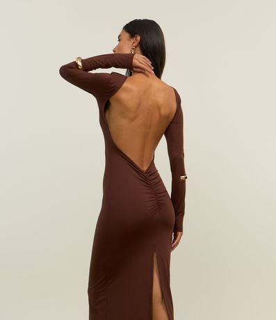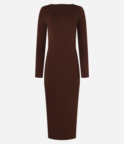 Vestido feminino de modelo new midi, com gola redonda e mangas longas, possui detalhes nas costas de decote profundo, franzido e fenda.