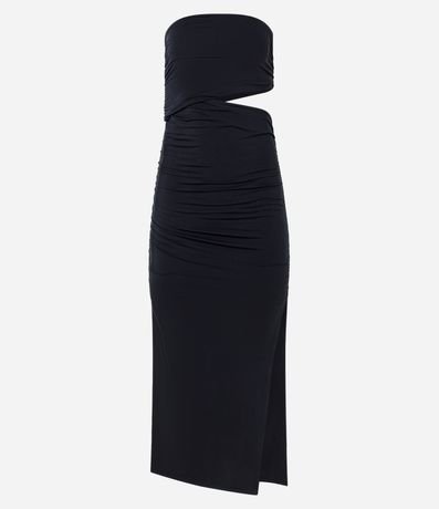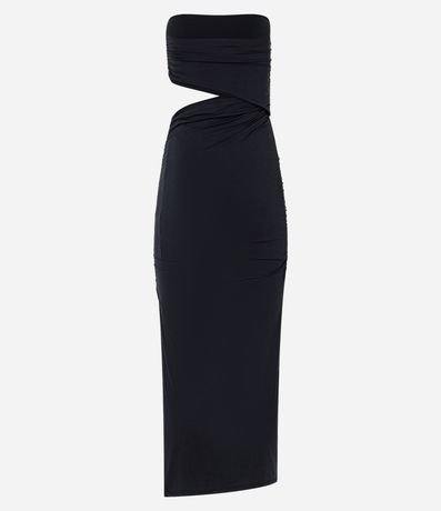 Vestido feminino de modelo new midi, confeccionado em malha de poliéster com elastano, sem alças e sem estampa. Possui recorte vazado, fenda lateral e drapeados.