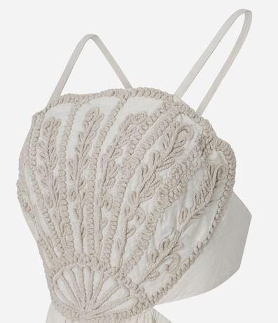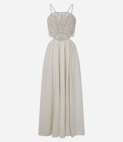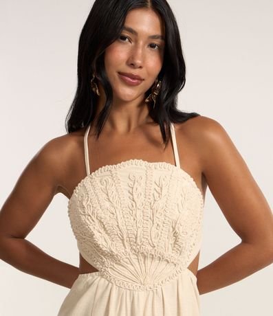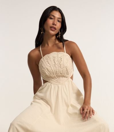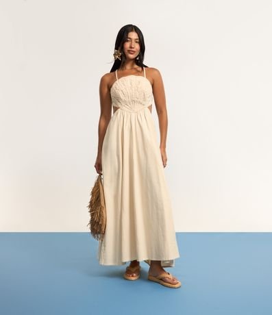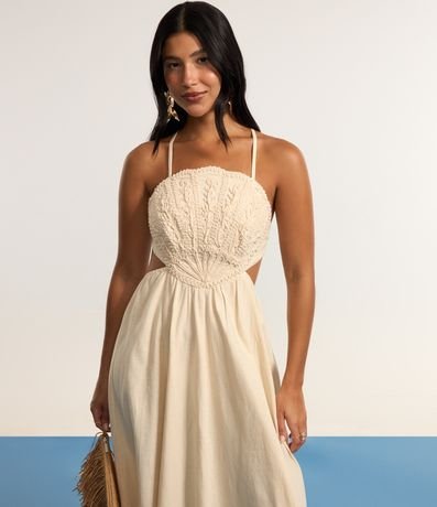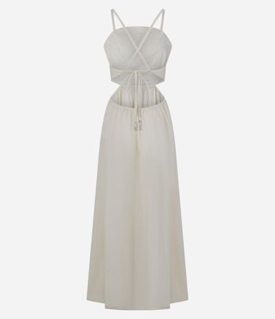 Ref: Vestido feminino confeccionado em algodão certificado bci com linho, peça no modelo new midi com frente única em forma de concha detalhada, alças finas cruzadas nas costas de amarração e recortes laterais.