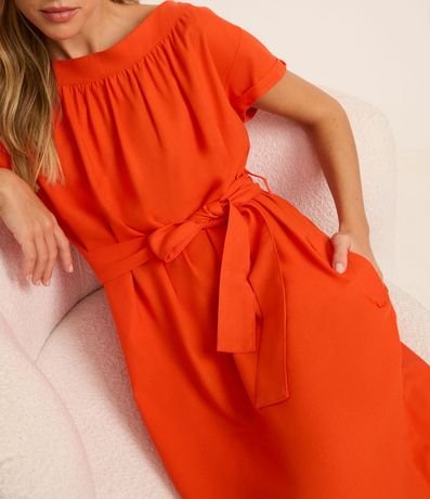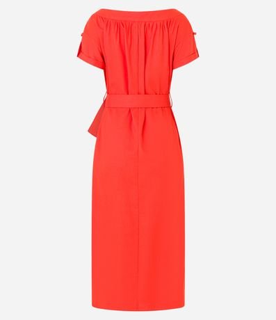 Ref: Vestido feminino confeccionado em linho com viscose mais sustentável em boas práticas ambientais, peça no modelo new midi com ombro a ombro, cinto de amarração na cintura e barra arredondada.