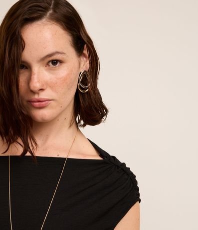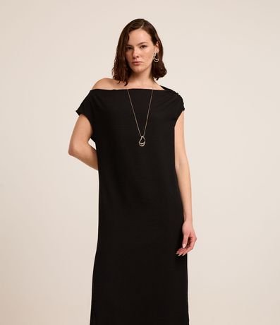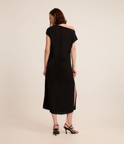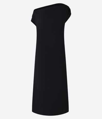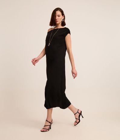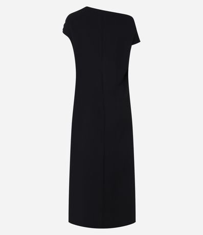 Ref: Vestido feminino confeccionado com airflow em boas práticas ambientais, no modelo new midi com decote assimétrico drapeado, manga curta, lateral com fenda.
