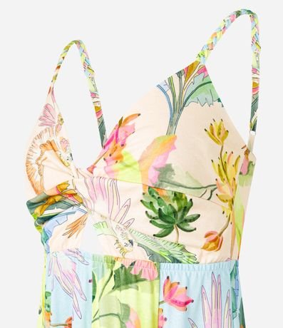 Ref: Vestido new midi confeccionado em algodão com decote torcido, alças finas trançadas e mix de estampas tropical.