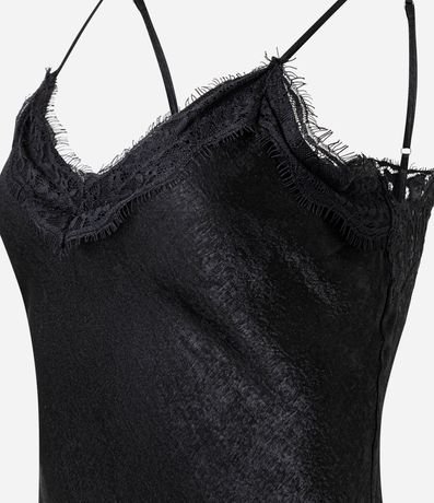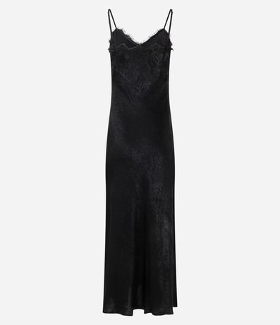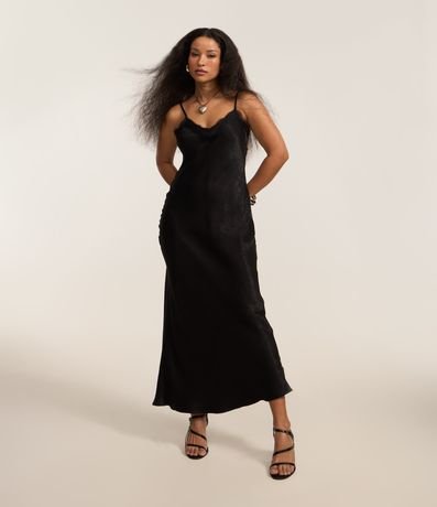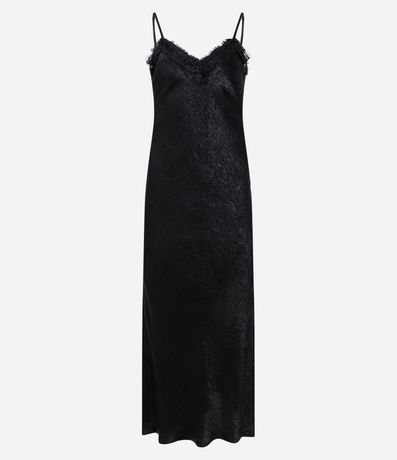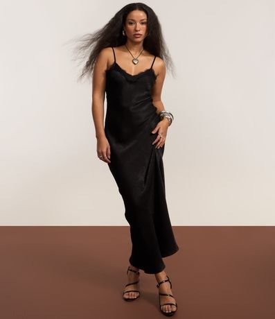 Vestido feminino em cetim no modelo new midi, com decote em v com renda e alças finas.
