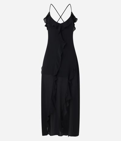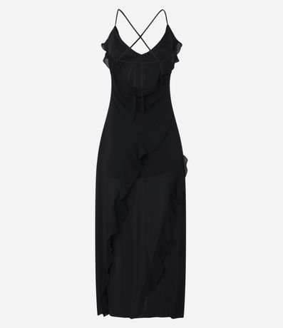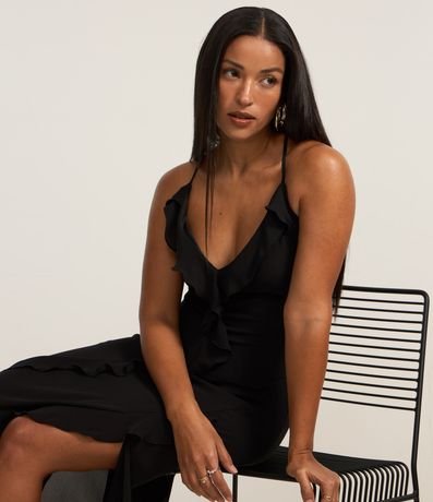 Vestido new midi com alcinha fina cruzada nas costas, confeccionado em chiffon e babado no busto e frontal.