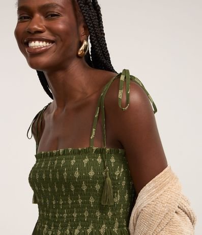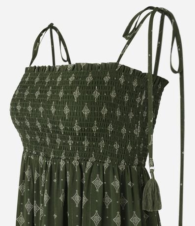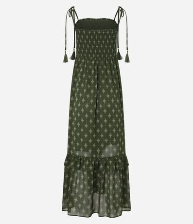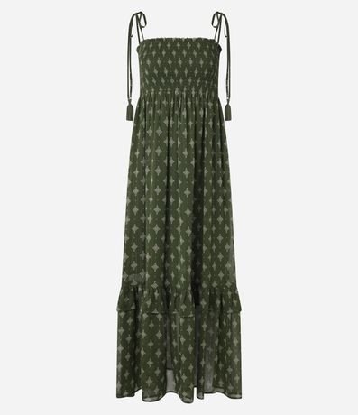 Vestido new midi feminino, confeccionado em chiffon, com decote reto e amarração nas alcinhas. A peça também conta com lastex no busto e costas, recortes na barra com babado e estampa arabescos.