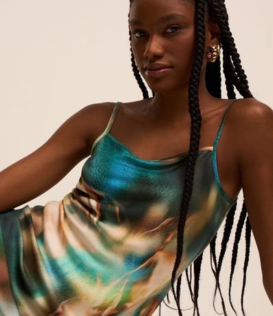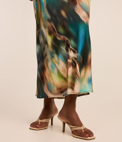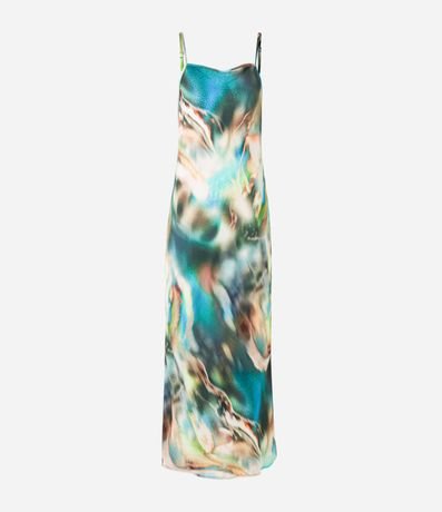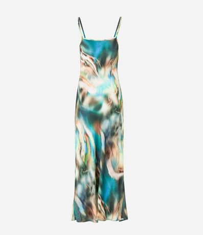 Vestido feminino de modelo new midi, com decote reto e alças finas. Possui estampa abstrata com efeito manchado.