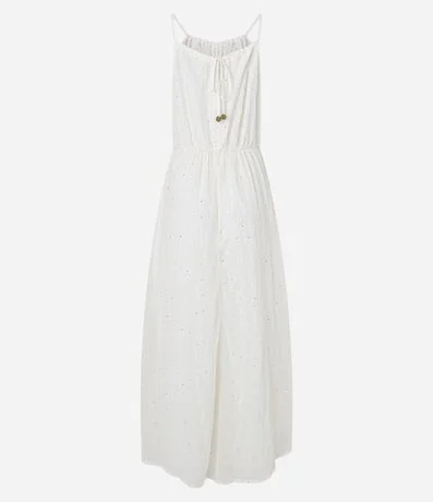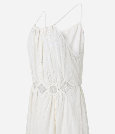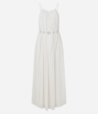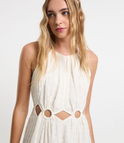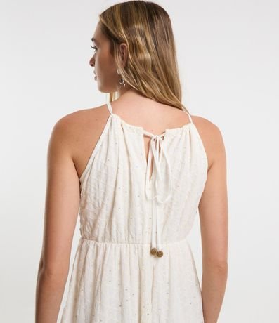 Ref: Vestido new midi com decote halter, alcinhas finas com amarração nas costas, bordado, recortes vazados na cintura e confeccionado em crepe.