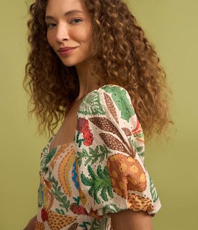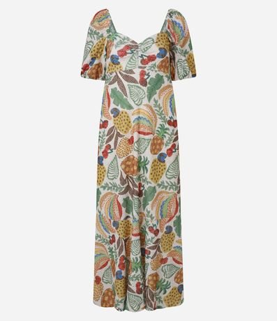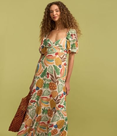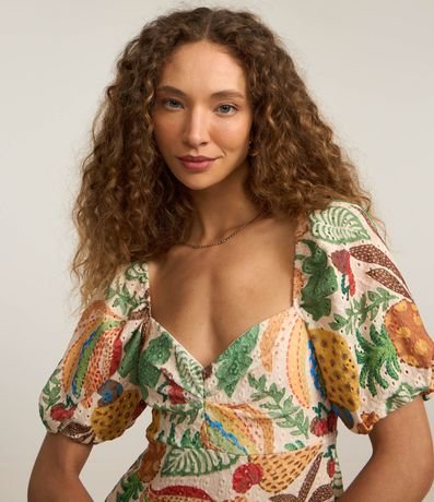 Ref: Vestido new midi com manga curta godê, confeccionado em laise, franzidinho no busto e estampa floral.