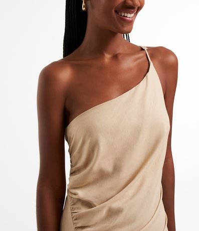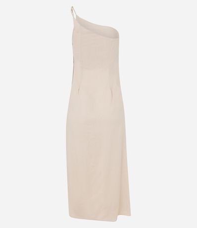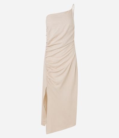Vestido New Midi em Linho com Ombro Só e Drapeado Lateral