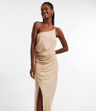 Vestido new midi, um ombro só com alcinha fina, drapeado lateral e fenda.
