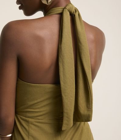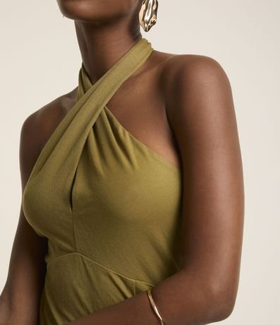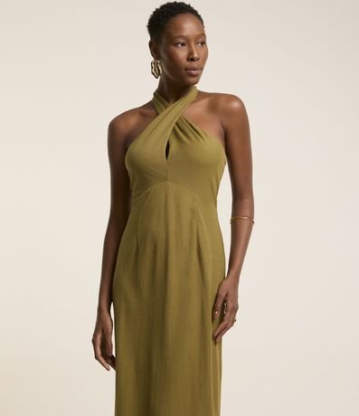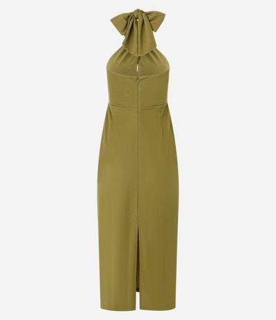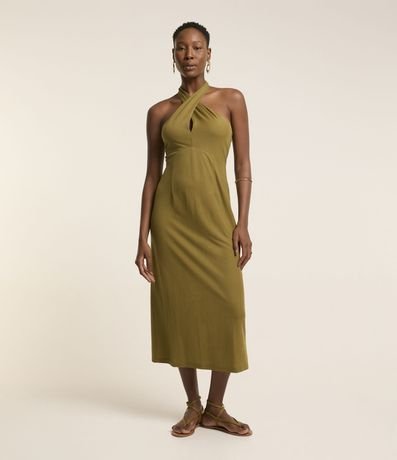 Ref: Vestido feminino de modelo new midi, confeccionado em malha piquet, com decote frente única e amarração no pescoço. Sem estampa, possui recorte franzido no busto, fenda nas costas e fechamento com zíper também nas costas.