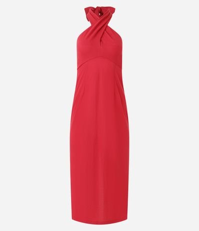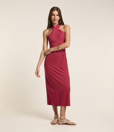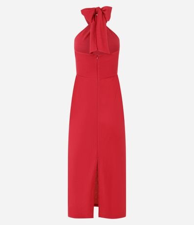 Ref: Vestido feminino de modelo new midi, confeccionado em malha piquet, com decote frente única e amarração no pescoço. Sem estampa, possui recorte franzido no busto, fenda nas costas e fechamento com zíper também nas costas.