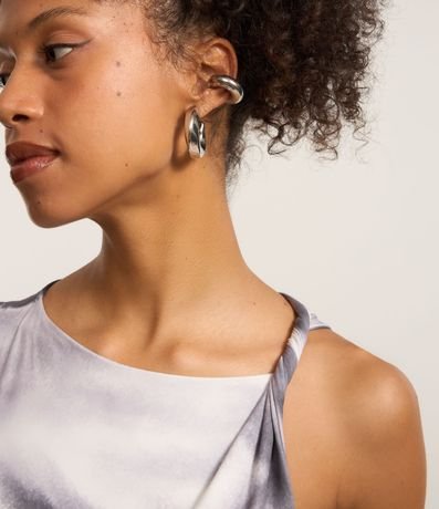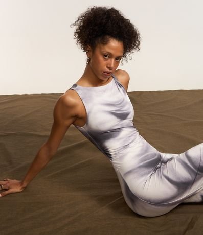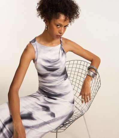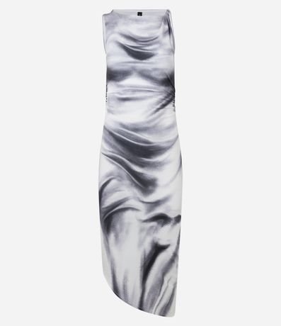 Vestido new midi sem manga, confeccionado em microfibra, franzidinhos nas laterais, estampa abstrata e barra assimétrica.