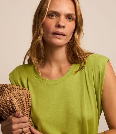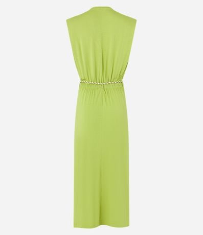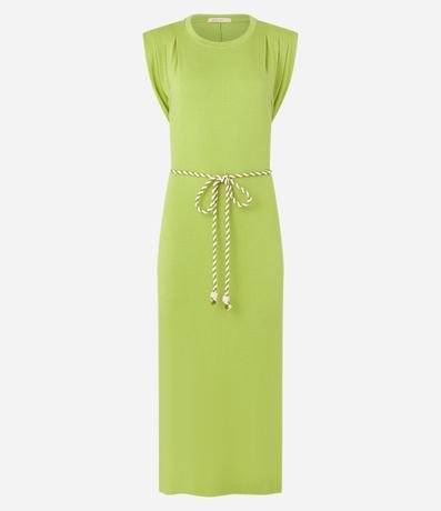Vestido new midi, sem mangas, confeccionado em moletinho com gola redonda, ombreias e amarração na cintura por cinto de cordão.