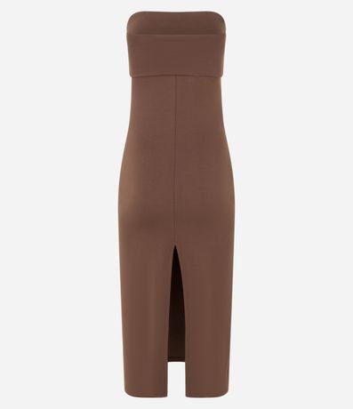 Vestido new midi, confeccionado em ponto roma, decote tomara que caia com busto sobreposto, drapeado na lateral e fenda na parte de trás.