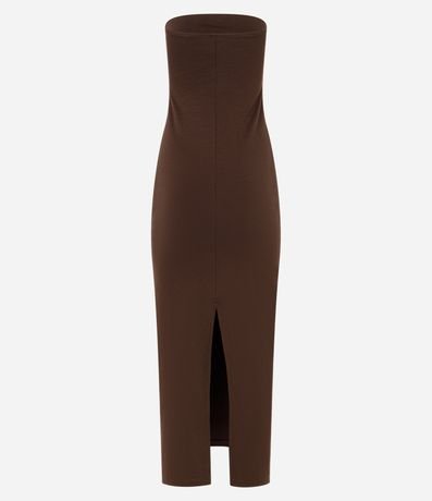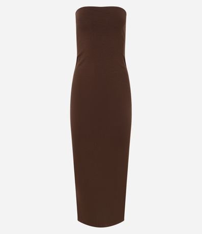 Ref: Vestido new midi, decote tomara que caia, justo, confeccionado em ponto roma e com fenda na parte de trás.