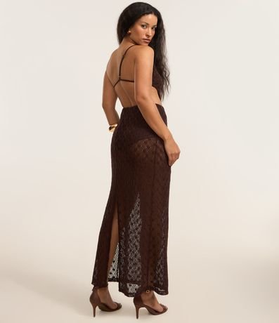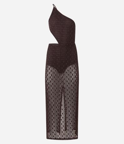Vestido feminino confeccionado em renda, no modelo new midi com frente única, ombro só, alça fina, recortes laterais e sobreposição com transparência.