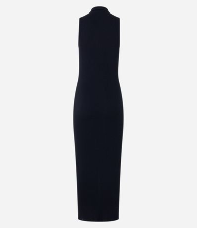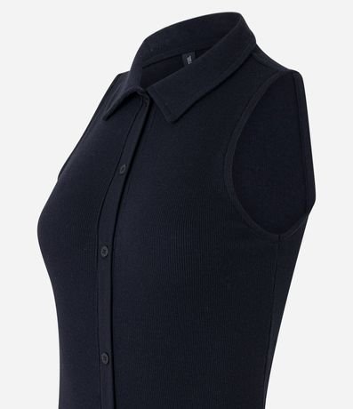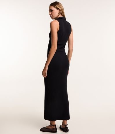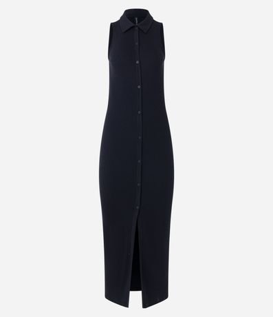 Vestido new midi com golinha polo, sem mangas, abotoamento frontal e fenda.