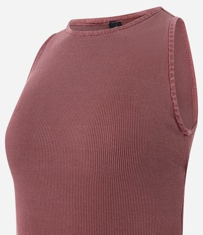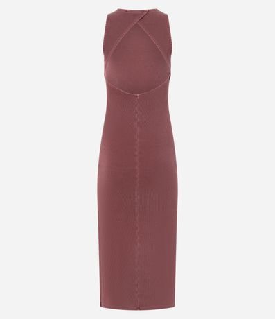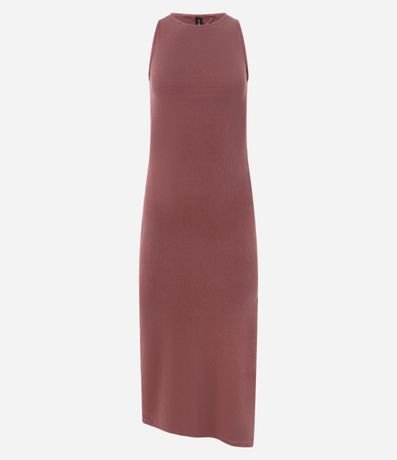 Vestido feminino confeccionado em ribana de algodão, sem estampa, com efeito marmorizado, gola redonda e sem mangas. Possui textura canelada e recorte aberto nas costas.