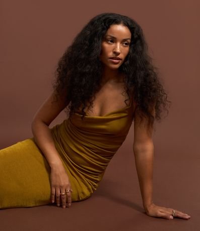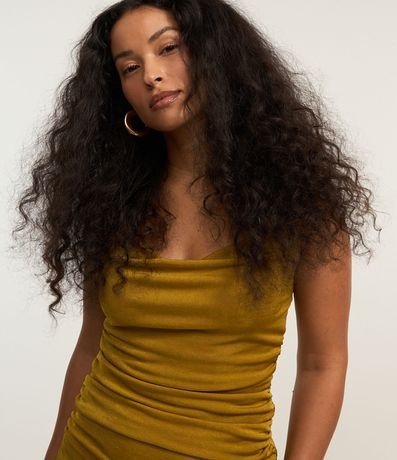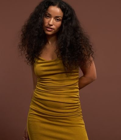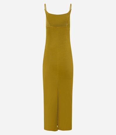 Vestido new midi com alcinha fina, confeccionada em ribana com franzidinho lateral e fenda na parte de trás.