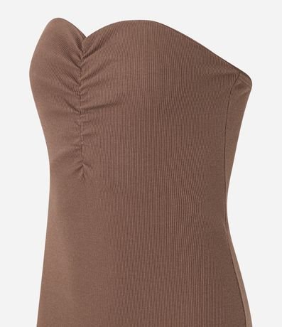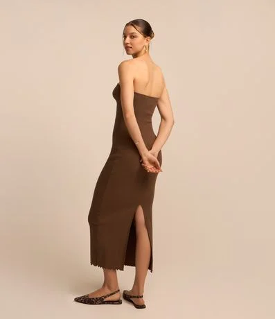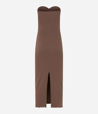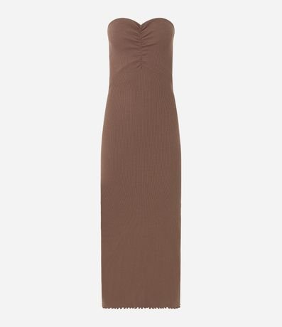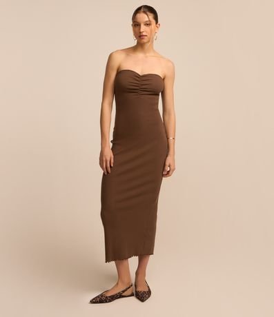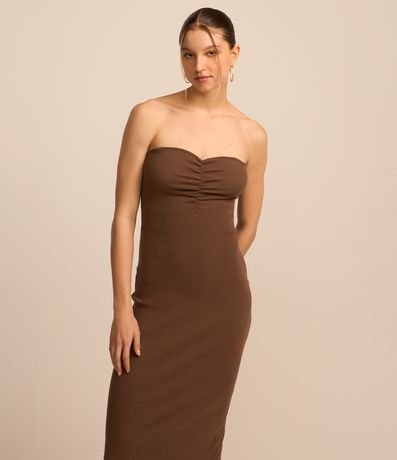 Ref: Vestido new midi com decote tomara que caia, drapeado no busto, confeccionado em ribana e com fenda na parte de trás.