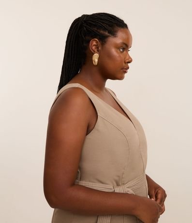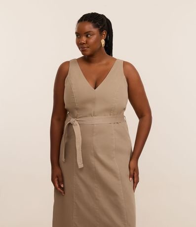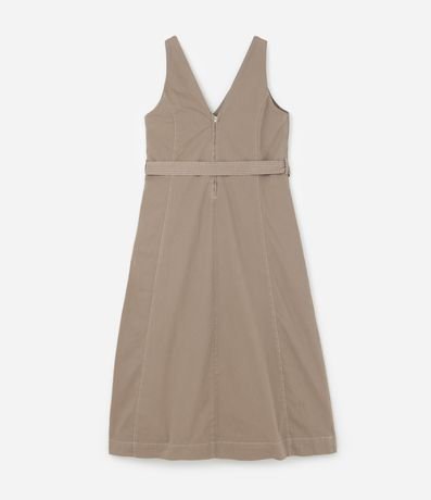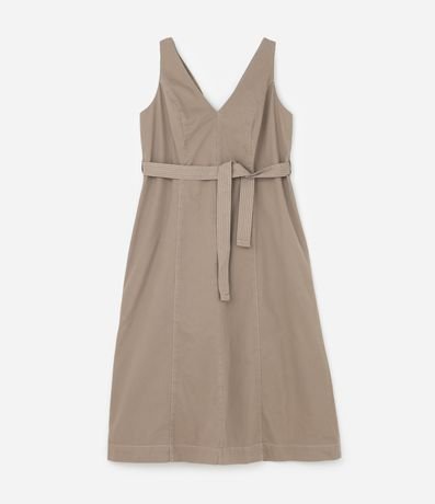 Ref: Vestido sem mangas confeccionado em sarja de algodão mais sustentável. A peça tem decote V e faixa para amarração na cintura.
